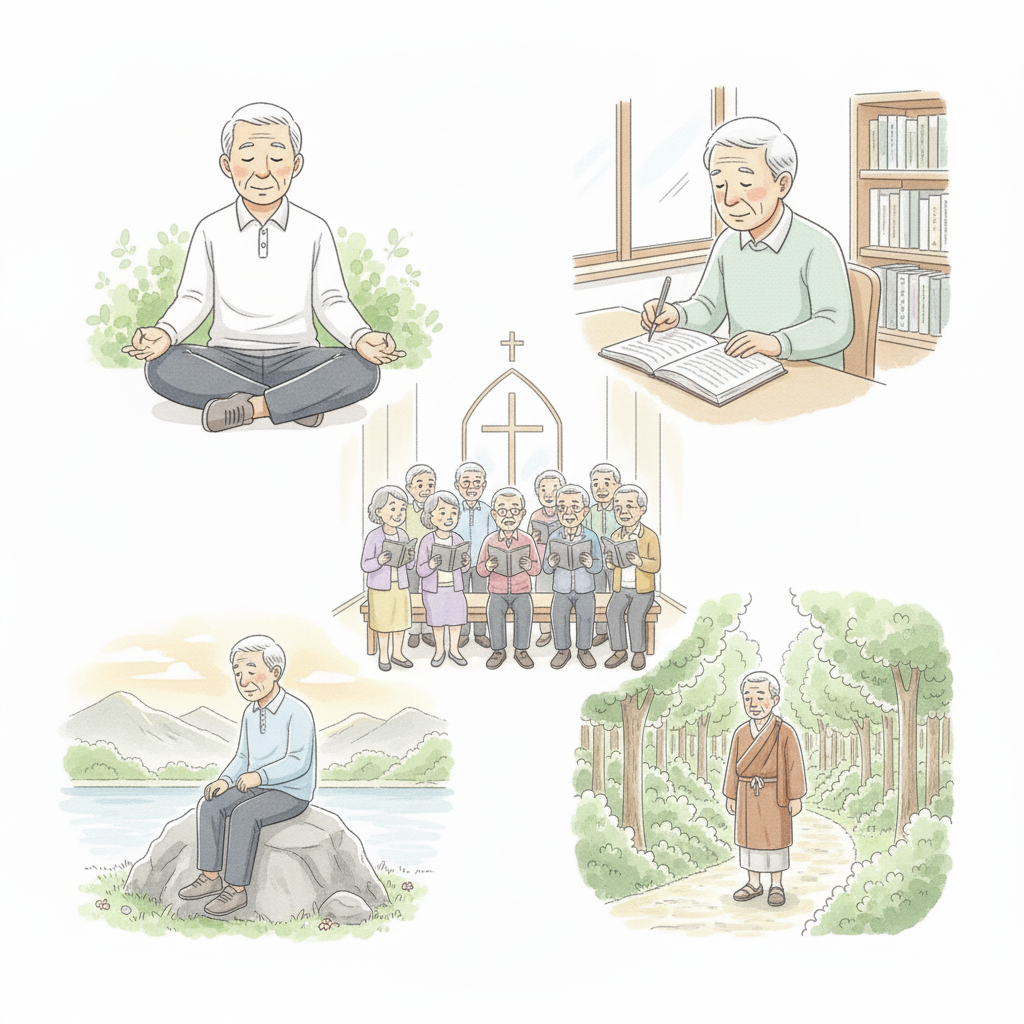 - 영적인 활동 및 신앙생활: 종교나 철학에 기반한 영적인 활동은 삶과 죽음에 대한 깊은 이해를 돕고, 큰 의미 체계 속에서 자신의 존재를 확인함으로써 노년기 불안을 줄여준다. 종교 활동이 아니더라도, 자연 속에서 사색하거나 자신만의 방식으로 삶의 가치를 되돌아보는 것도 여기에 포함된다.