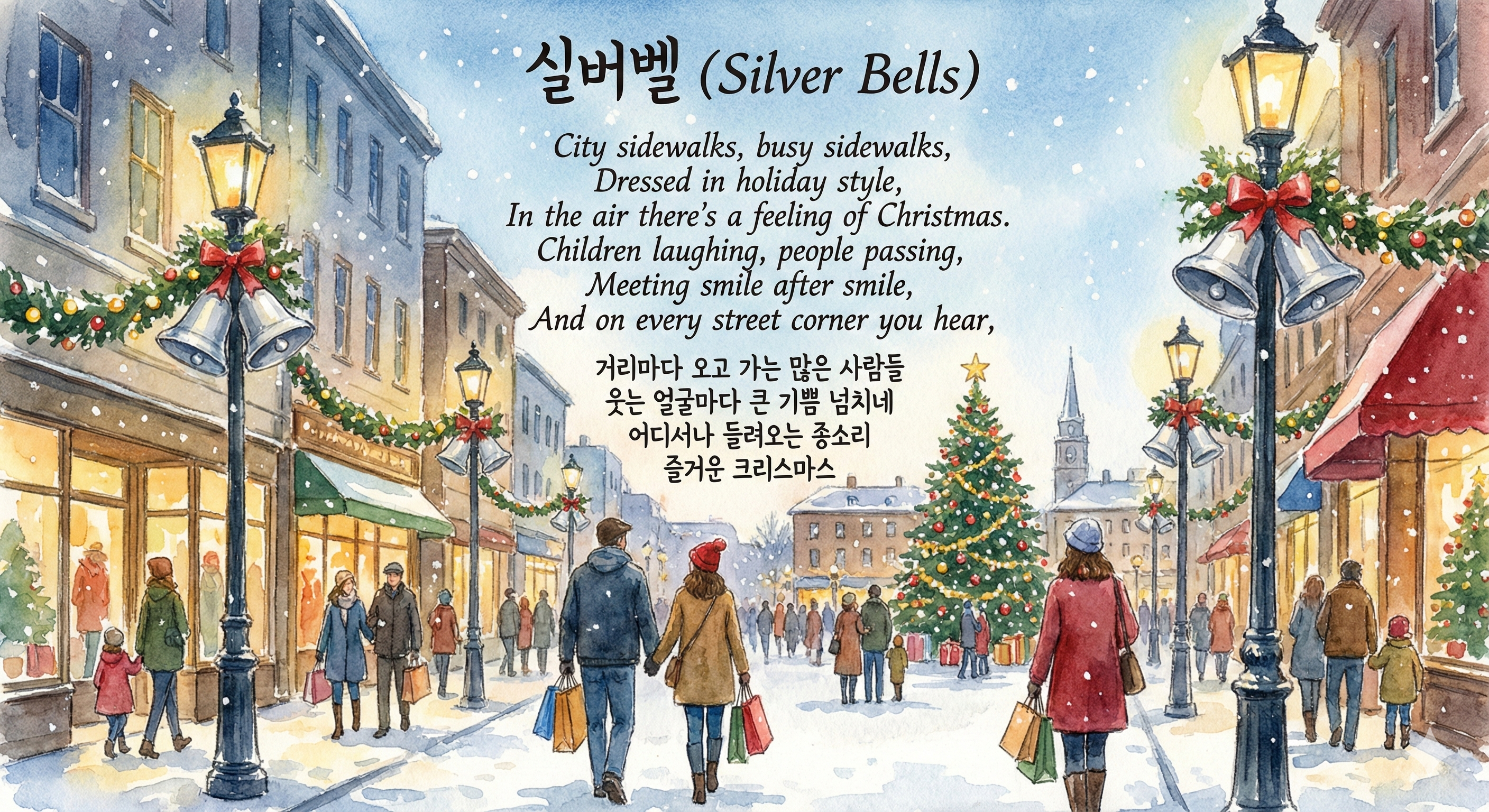 거리마다 오고 가는 많은 사람들 웃는 얼굴마다 큰 기쁨 넘치네 어디서나 들려오는 종소리 즐거운 크리스마스