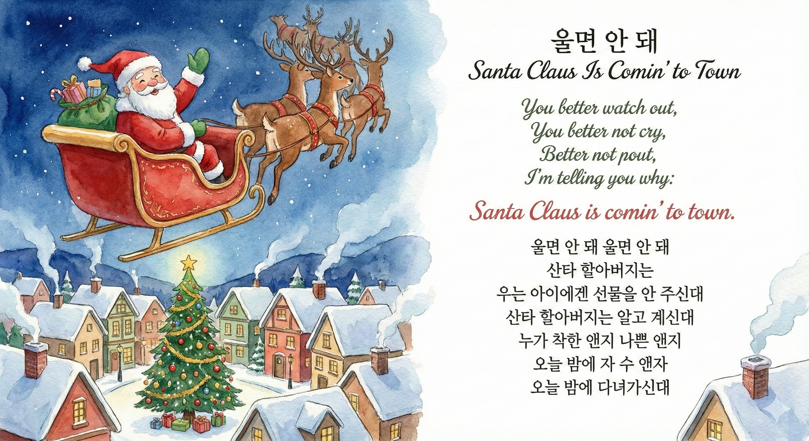 울면 안 돼 울면 안 돼 산타 할아버지는 우리 마을을 오늘 밤에 다녀가신대