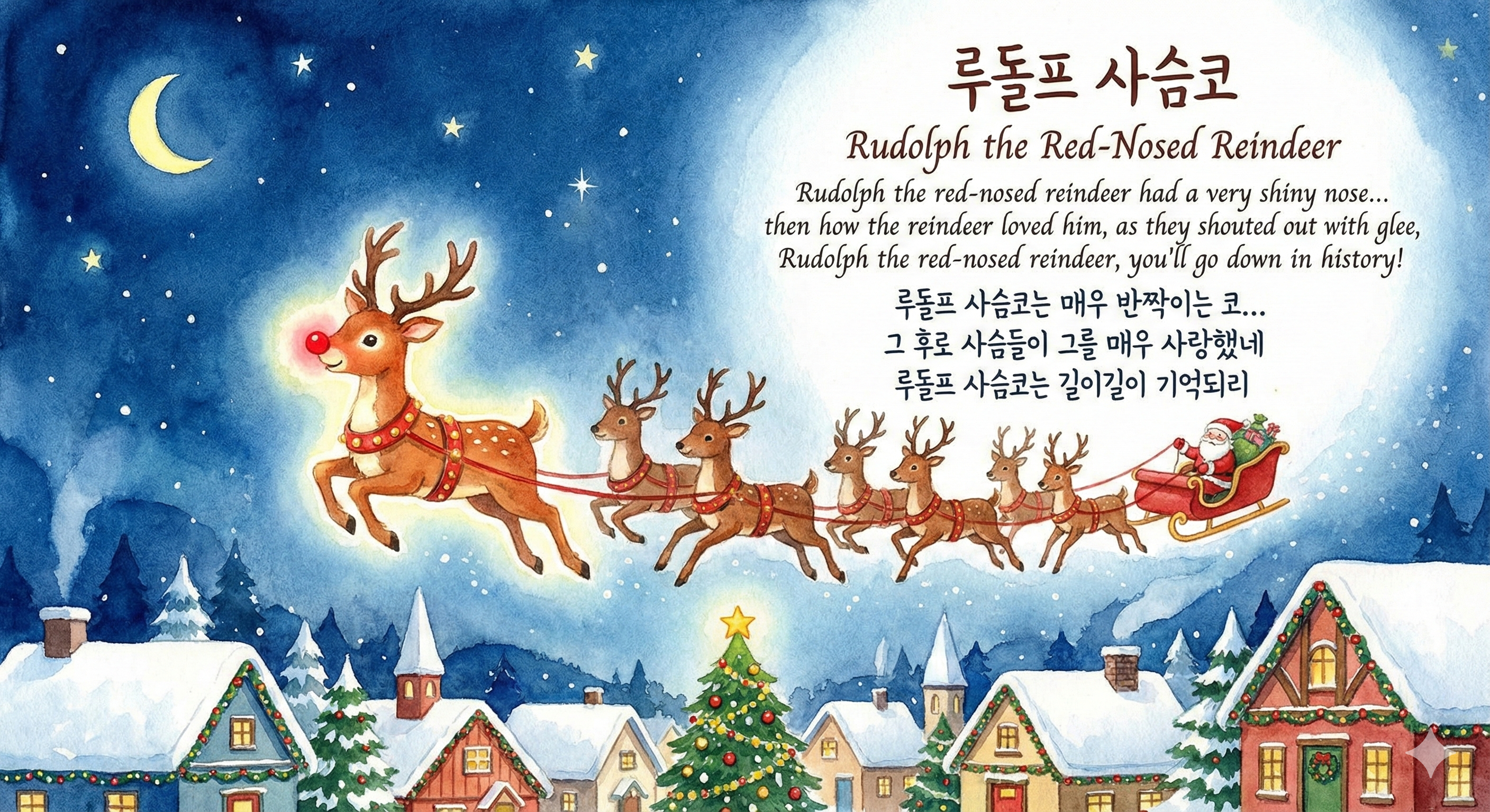 루돌프 사슴코는 매우 반짝이는 코 만일 네가 봤다면 불붙는다 했겠지 다른 모든 사슴들 놀려대며 웃었네 가엾은 저 루돌프 외톨이가 되었네