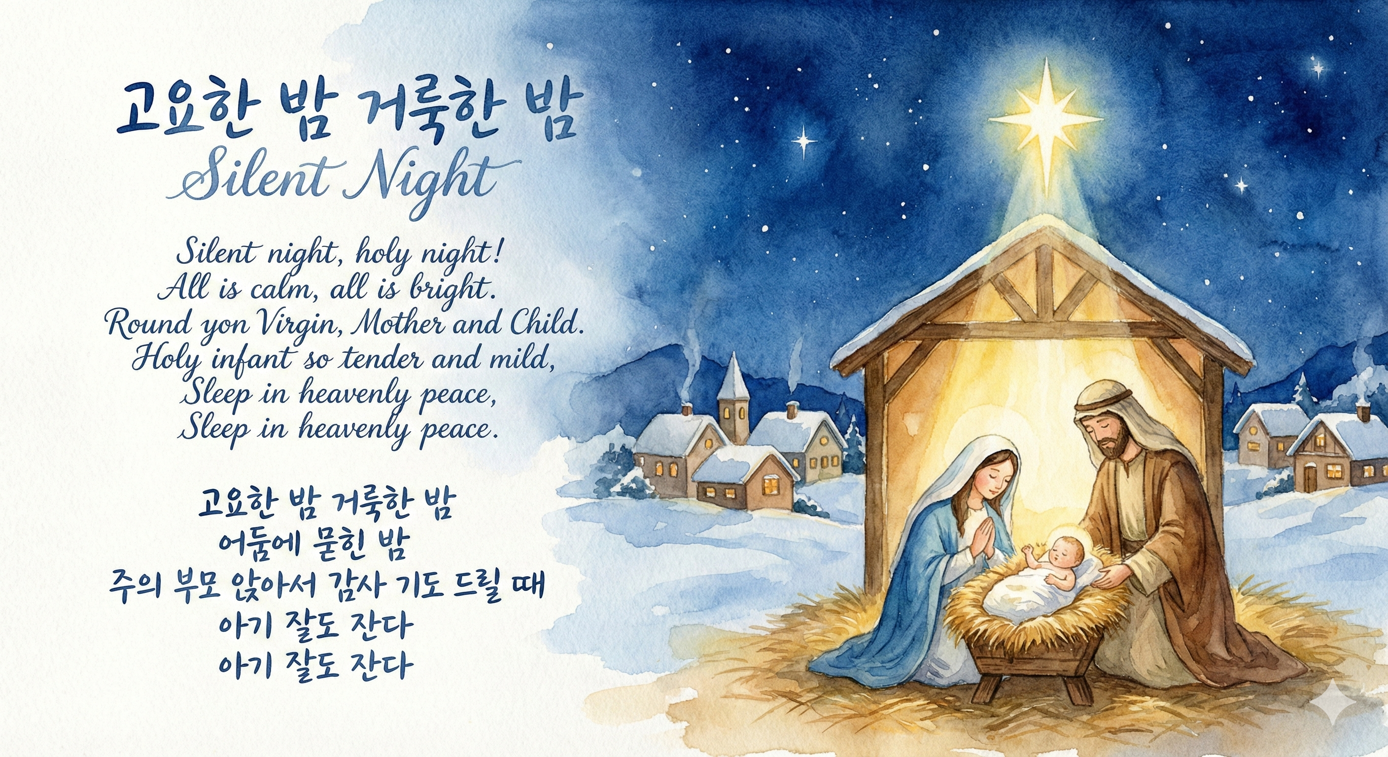 고요한 밤 거룩한 밤 어둠에 묻힌 밤 주의 부모 앉아서 감사 기도 드릴 때 아기 잘도 잔다 아기 잘도 잔다