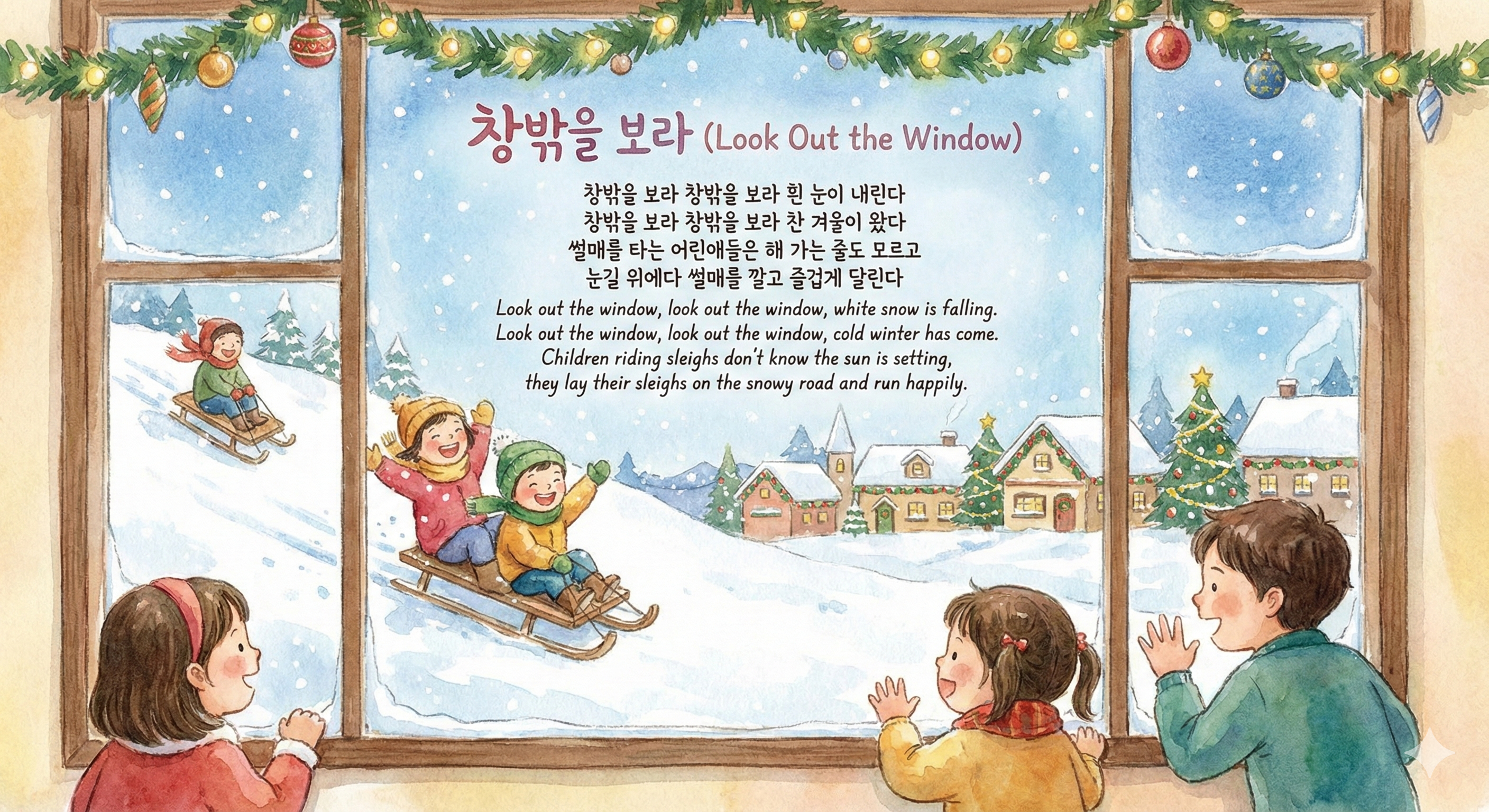 창밖을 보라 창밖을 보라 흰 눈이 내린다 창밖을 보라 창밖을 보라 찬 겨울이 왔다