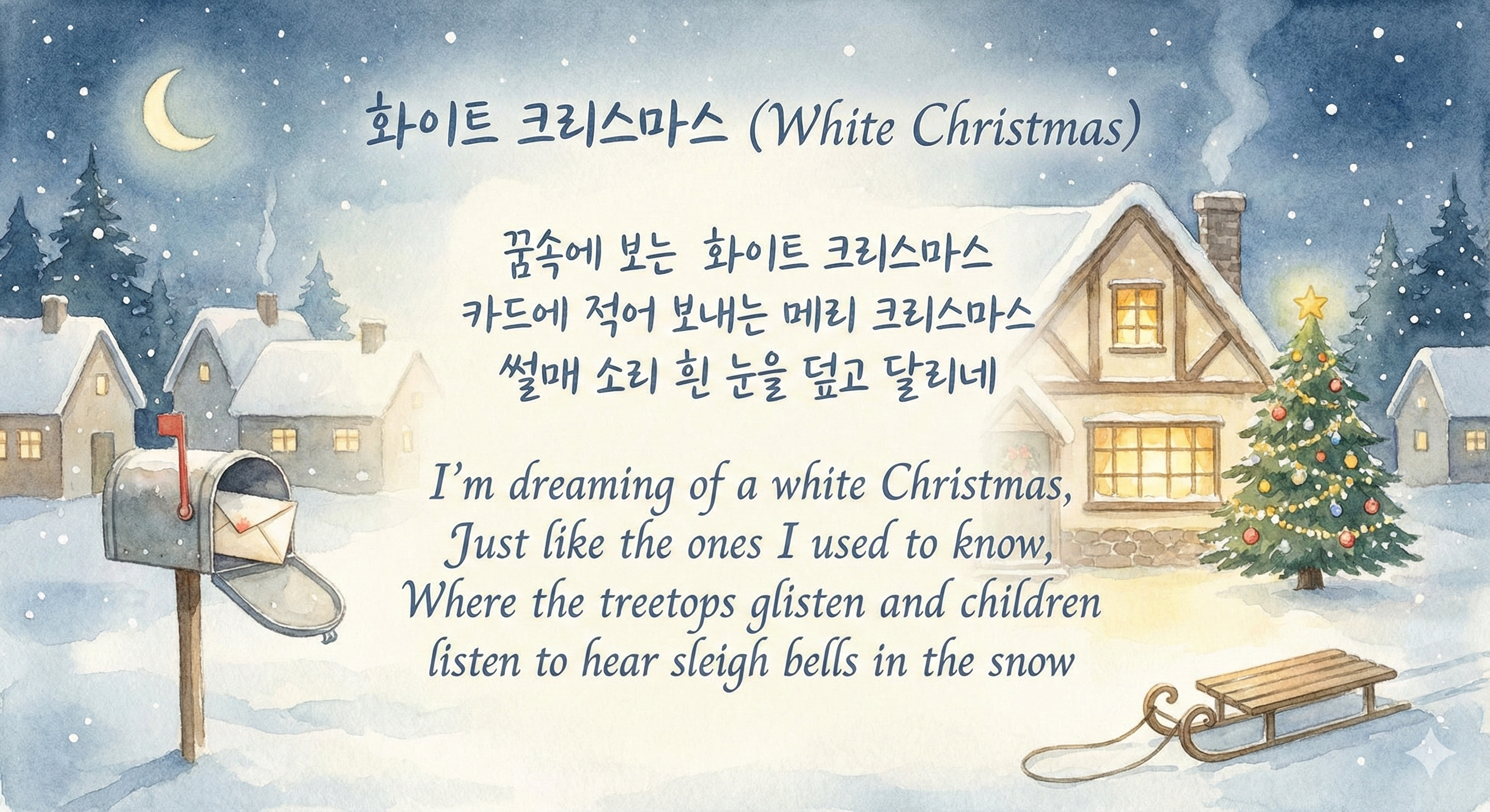 꿈속에 보는 화이트 크리스마스 카드에 적어 보내는 메리 크리스마스 썰매 소리 흰 눈을 덮고 달리네