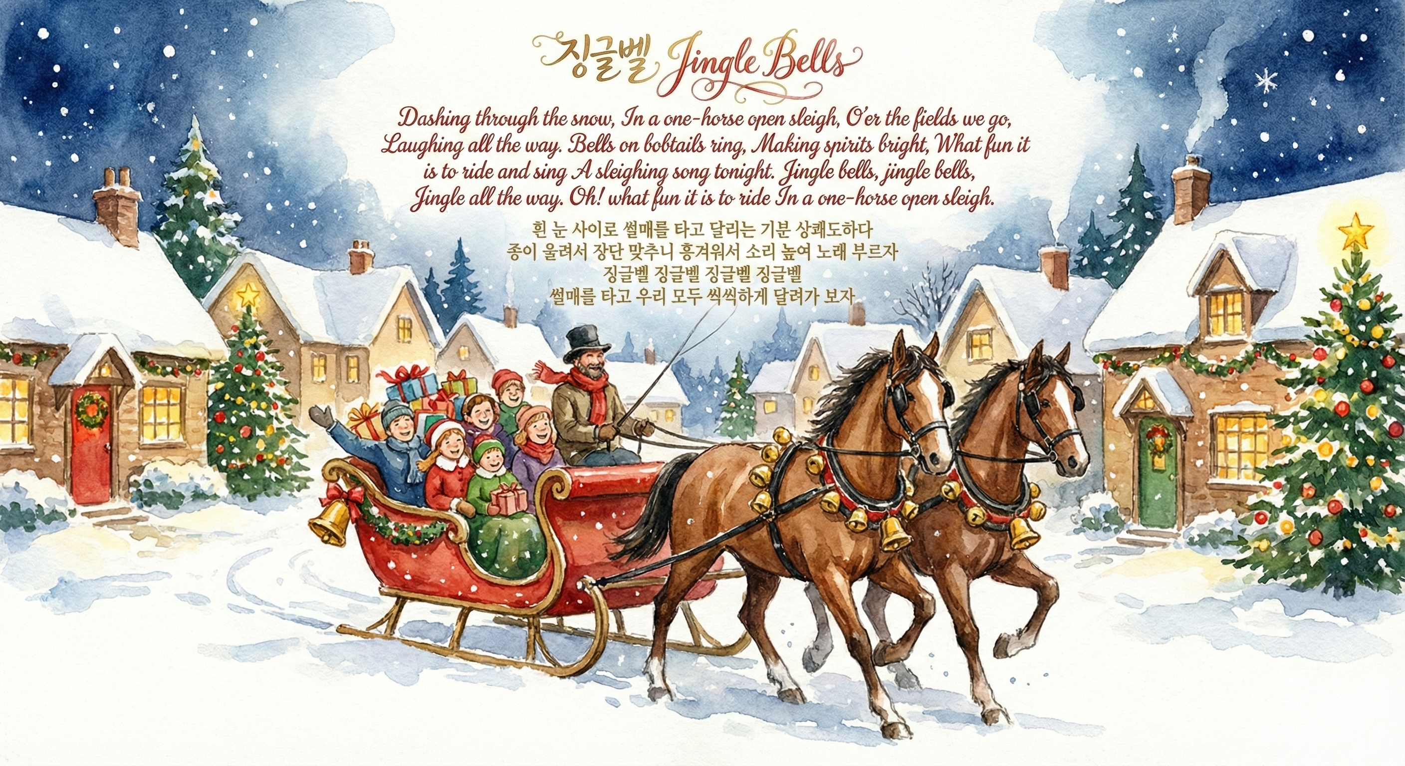흰 눈 사이로 썰매를 타고 달리는 기분 상쾌도 하다 종이 울려서 장단 맞추니 흥겨워서 소리 높여 노래 부르자
