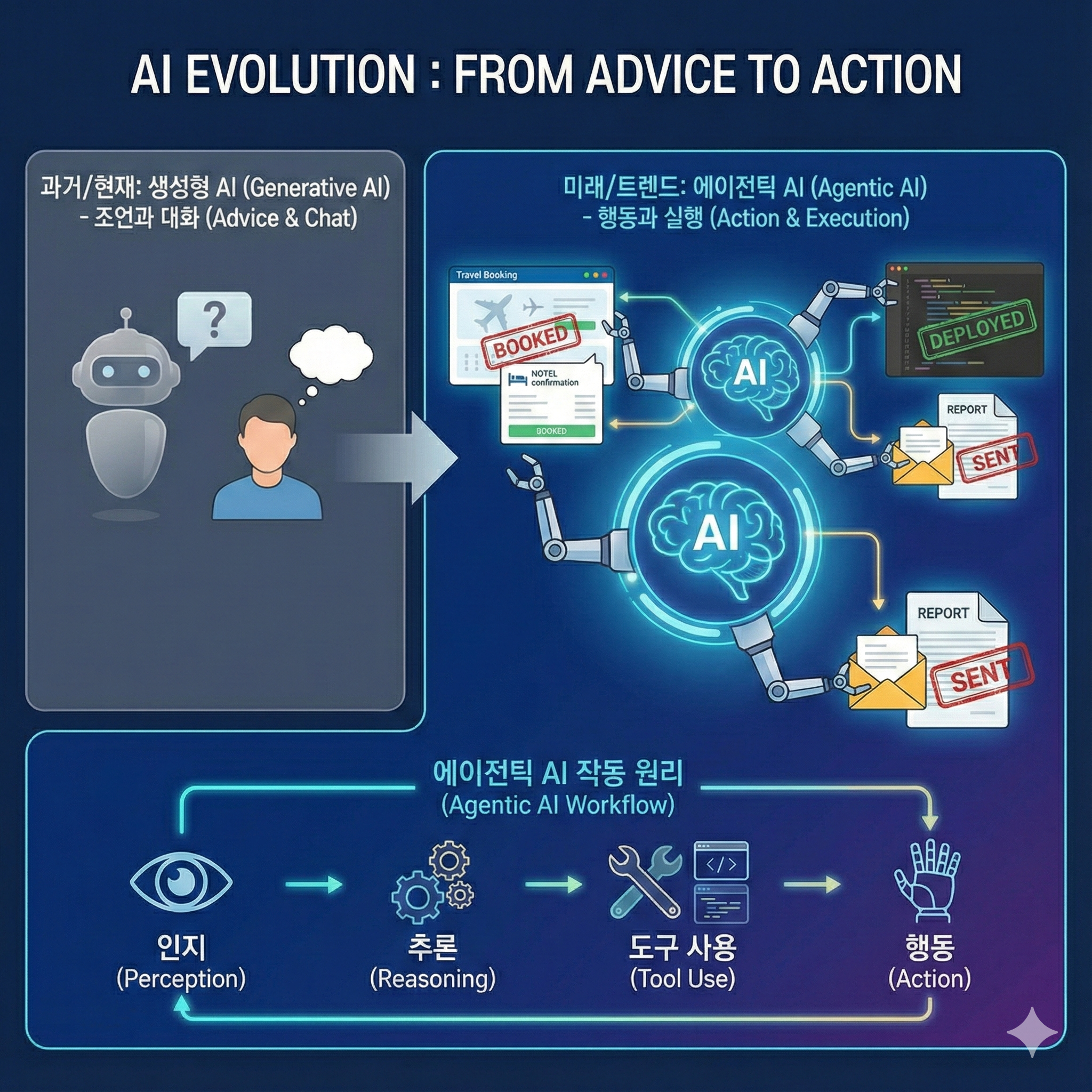 불과 작년까지만 해도 우리는 질문을 던지면 그럴듯한 답변을 내놓는 '생성형 AI'에 열광했습니다. 하지만 2025년, AI 기술의 흐름이 완전히 바뀌고 있습니다. 이제 AI는 단순히 조언만 해주는 똑똑한 말동무가 아니라, 내 명령을 듣고 실제로 행동하는 '유능한 비서'로 진화했기 때문입니다.