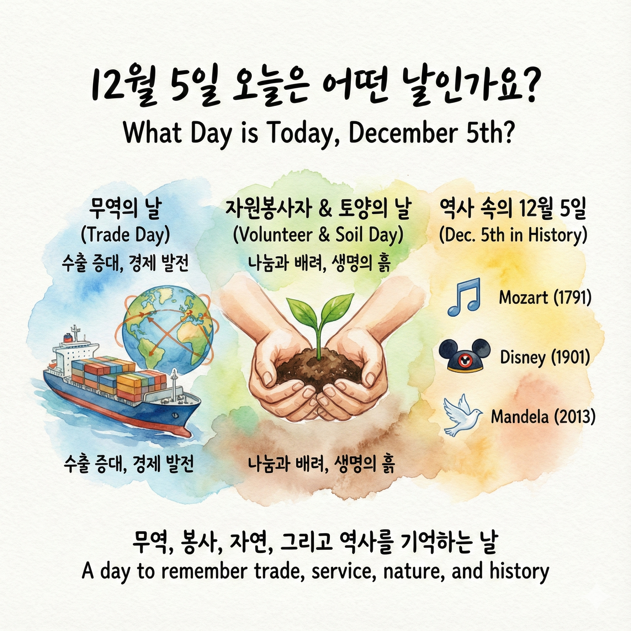 12월 5일은 한국뿐만 아니라 국제적으로도 꽤 의미 있는 기념일들이 모여 있는 날입니다. 오늘이 어떤 의미를 가지는지 주요 내용을 정리해 드릴게요.