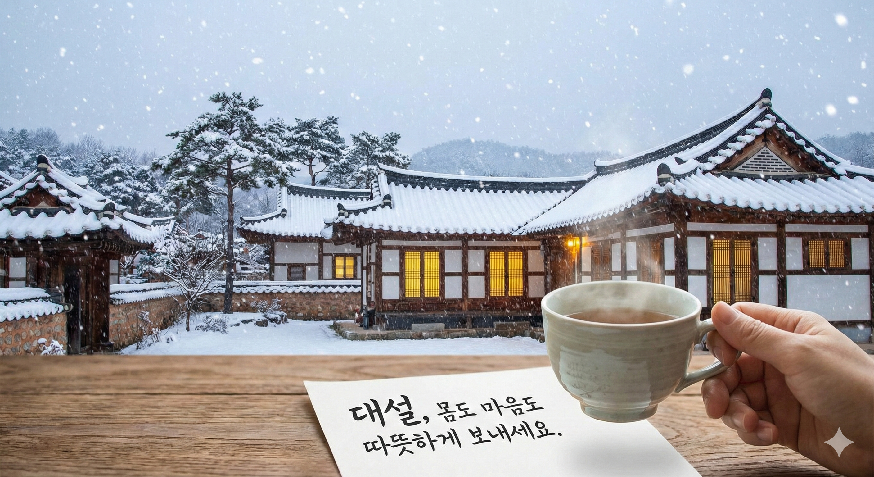 오늘 대설을 맞아 날씨가 많이 쌀쌀해졌을 텐데, 따뜻한 차 한 잔과 함께 여유로운 일요일 보내시길 바랍니다.