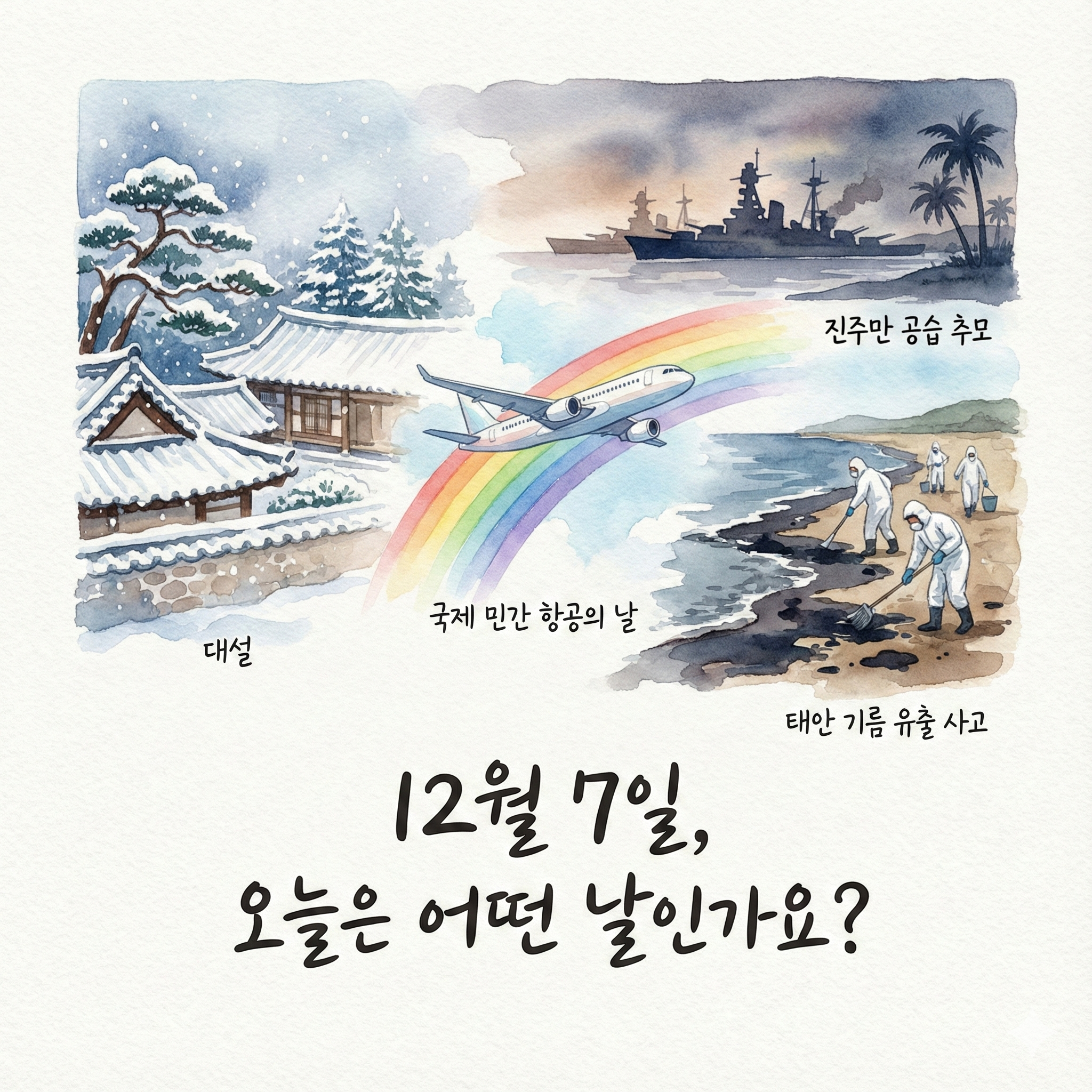 벌써 12월 7일, 달력에는 '대설(大雪)'이라고 적혀 있는데 창밖은 어떤가요? 이름처럼 함박눈이 펑펑 쏟아지길 기대했지만, 쌩쌩 부는 찬 바람만 겨울임을 실감하게 하네요. 옛말에 대설에 눈이 많이 와야 다음 해가 풍년이라는데, 눈 대신 우리 마음이라도 따뜻하게 채워야 하지 않을까요? 오늘이 단순히 12월의 첫 번째 일요일인 줄로만 아셨다면, 이 글을 꼭 보셔야 합니다. 2007년 12월 7일, 대한민국 서해안이 검은 기름으로 뒤덮였던 그날을 기억하시나요? 그리고 전 국민이 달려가 기적을 만들어냈던 그날이 바로 오늘입니다. 절기상 가장 눈이 많이 온다는 '대설'이자, 역사적으로 잊지 못할 사건들이 가득한 12월 7일의 숨겨진 의미를 지금 바로 정리해 드립니다.