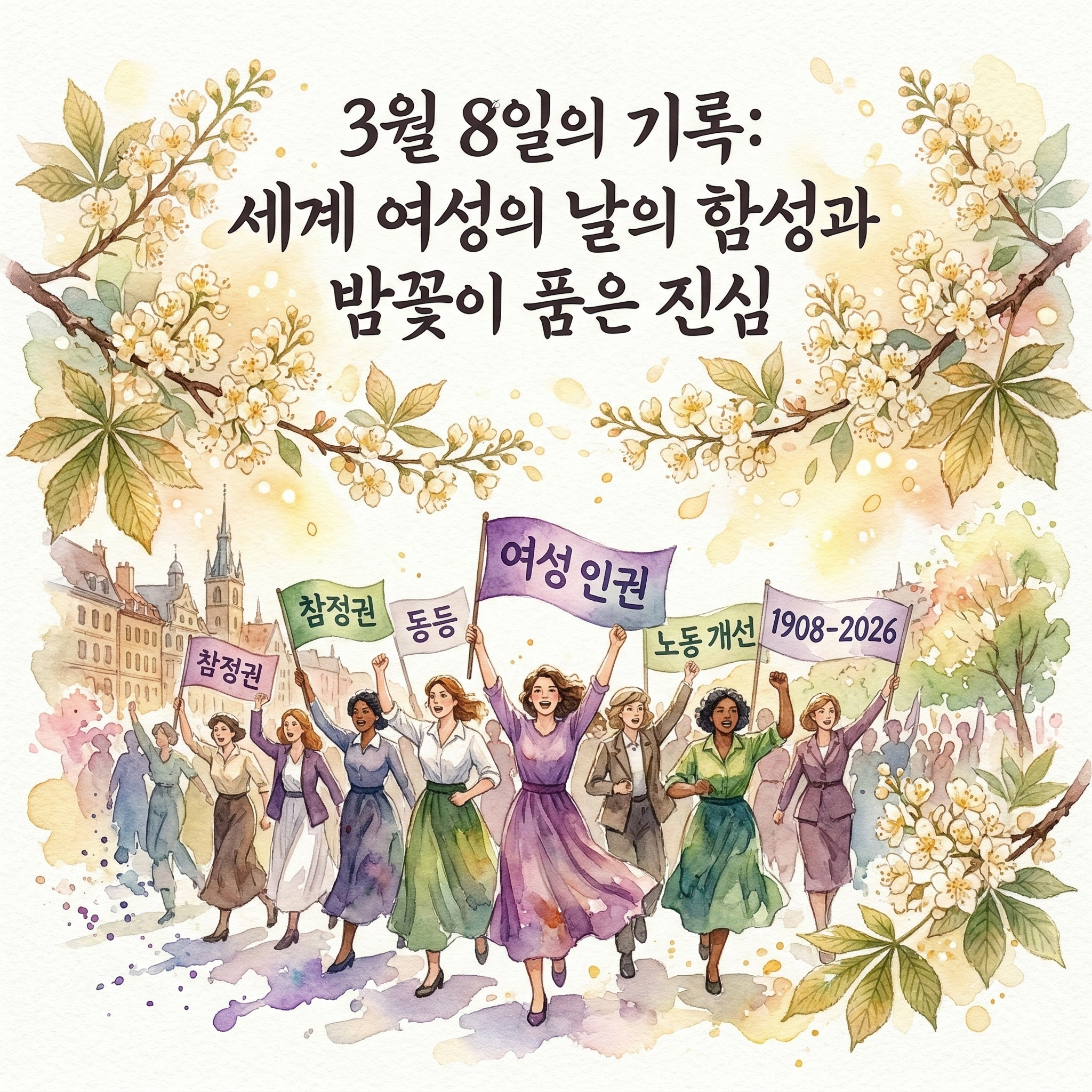 "투자는 치열하게, 삶은 여백처럼"이라는 말처럼, 잠시 숫자와 그래프에서 눈을 떼고 오늘 하루가 품은 시간의 무게를 가만히 음미해 보는 것은 어떨까요? 1년 중 67번째 날인 3월 8일은 '세계 여성의 날'을 비롯해 세계사의 굵직한 흐름이 바뀌고, 우리의 일상을 뒤바꾼 기술의 진보가 있었던 의미 있는 날입니다. 밤꽃의 소박한 진심과 스미소나이트의 평안이 깃든 오늘의 이야기, 찬찬히 펼쳐보겠습니다.